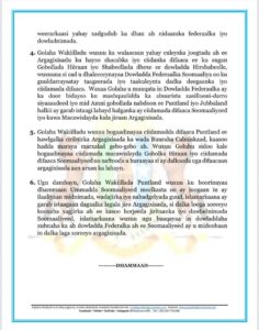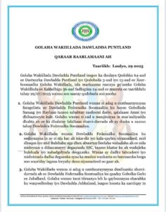 Golaha Wakiillada Maamulka Puntland ayaa maanta soo saaray qaraar rasmi ah oo ay si adag ugu cambaareeyeen faragelinta ay Dowladda Federaalka Soomaaliya ku hayso gobollada SSC, Gedo iyo Jubbaland, iyadoo laga digay khataraha ay leedahay siyaasadda kala-qaybinta bulshada iyo daandaansiga maamulka federaalka.