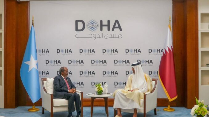 Madaxweynaha Dowlada Federaalka Soomaaliya Xasan Sheekh Maxamuud ayaa kulan kula qaatay magaalada Dooxa Amiirka dalka Qatar Sheekh Tamiim Bin Xamad Al Thani.