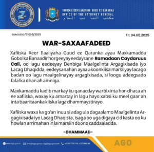 Xafiiska Xeer Ilaaliyaha Guud ayaa caddeeyay inuu si adag ula dagaallamayo dambiyada la xiriira argagaxisada iyo dhaqaalaha sharci darrada ah, isagoo si toos ah ugu digay cid kasta oo ku lug yeelata ama ka qayb qaadata hawlaha noocaas ah.