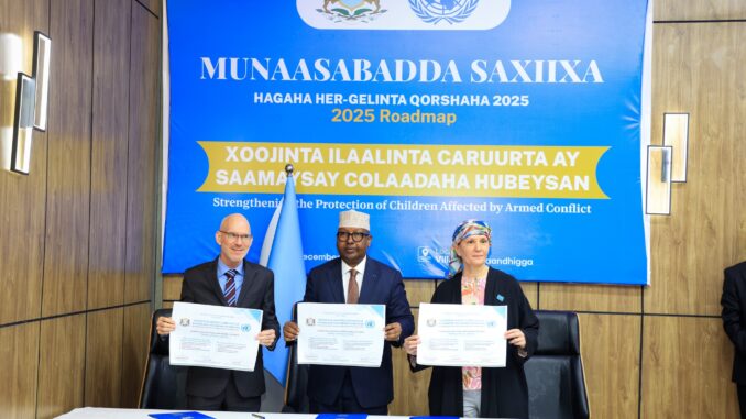 Dowladda Federaalka Soomaaliya iyo Qaramada Midoobay ayaa maanta si rasmi ah u kala saxiixday Hagaha Hirgelinta Road Map ka ee 2025, kaas oo lagu xoojinayo ilaalinta carruurta ay saameeyeen colaadaha hubeysan.